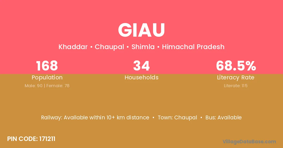 The literacy rate of Giau village is 68.45%. Male literacy stands at 77.78% and female literacy at 57.69%.