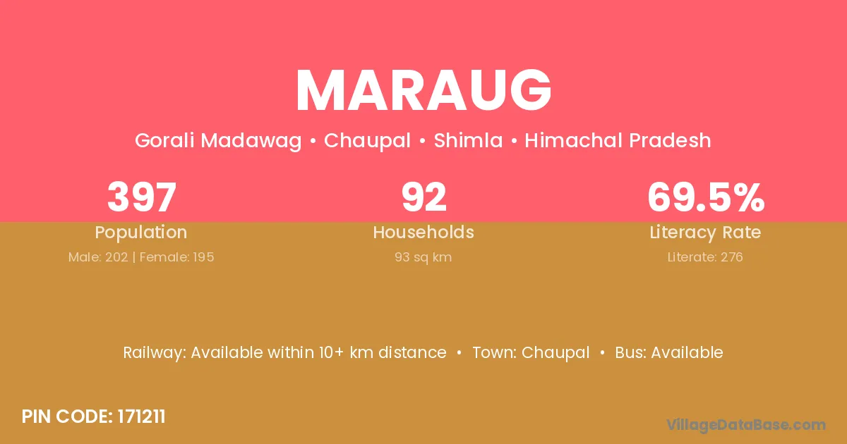 Maraug village has a total population of 397 people, of which 202 are males and 195 are females.
