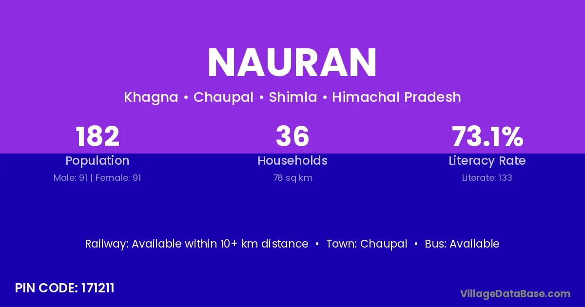Nauran village has a total population of 182 people, of which 91 are males and 91 are females.