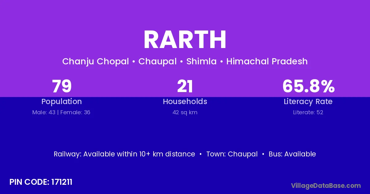 Rarth village has a total population of 79 people, of which 43 are males and 36 are females.