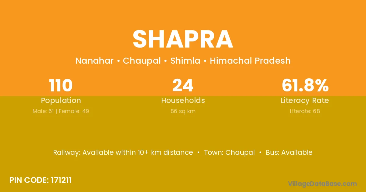 Shapra village has a total population of 110 people, of which 61 are males and 49 are females.