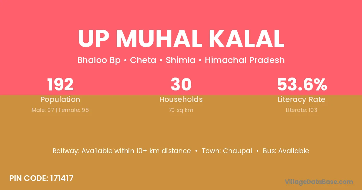 Up Muhal Kalal village has a total population of 192 people, of which 97 are males and 95 are females.
