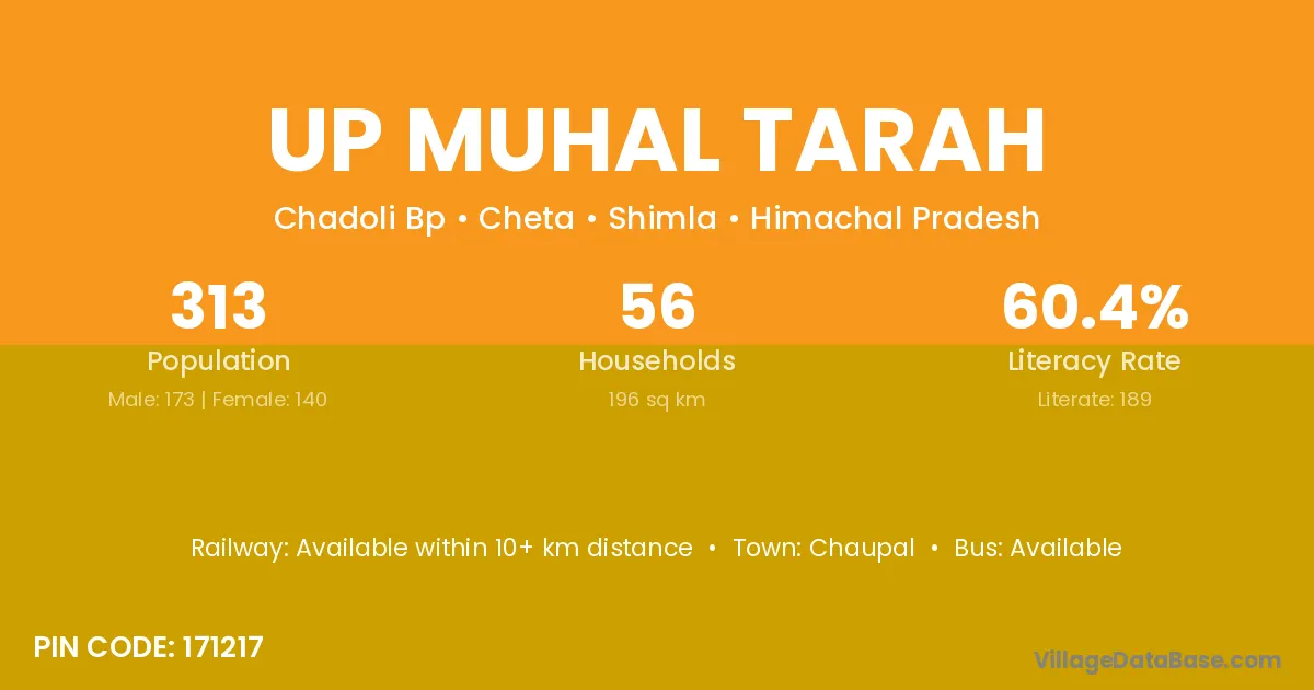 Up Muhal Tarah village has a total population of 313 people, of which 173 are males and 140 are females.
