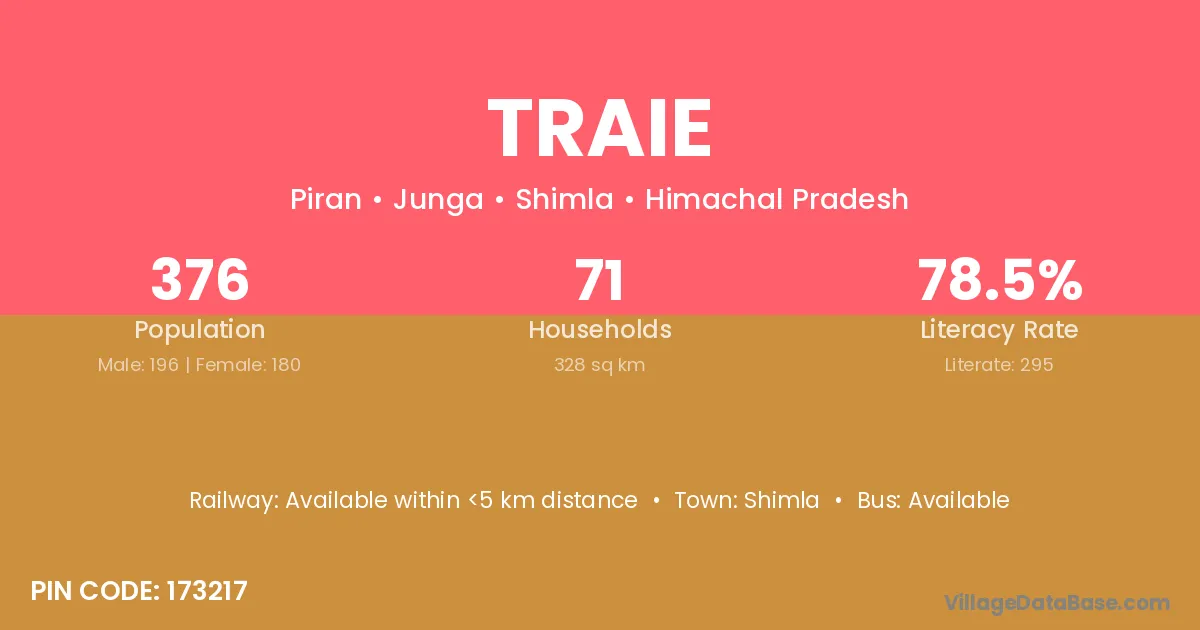 Traie village has a total population of 376 people, of which 196 are males and 180 are females.