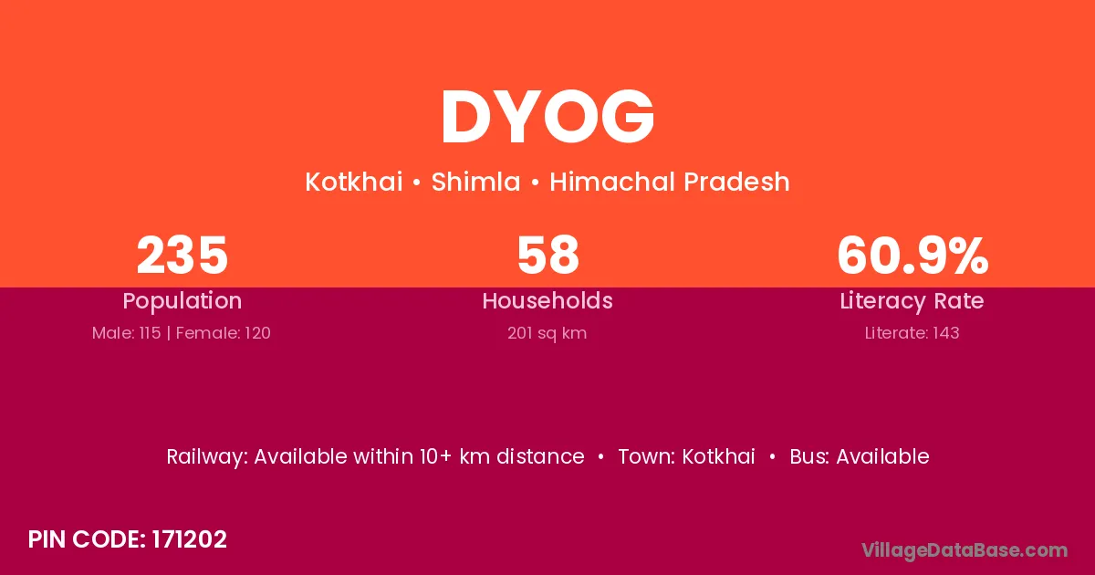 Dyog village has a total population of 235 people, of which 115 are males and 120 are females.