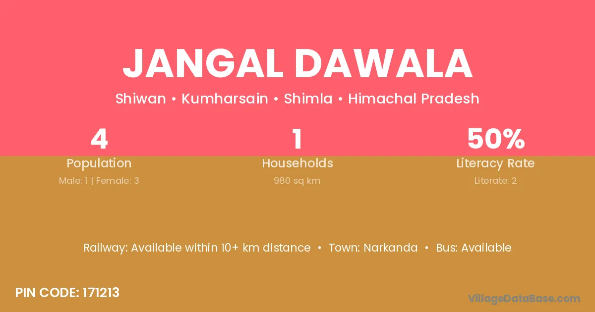 Jangal Dawala village has a total population of 4 people, of which 1 are males and 3 are females.