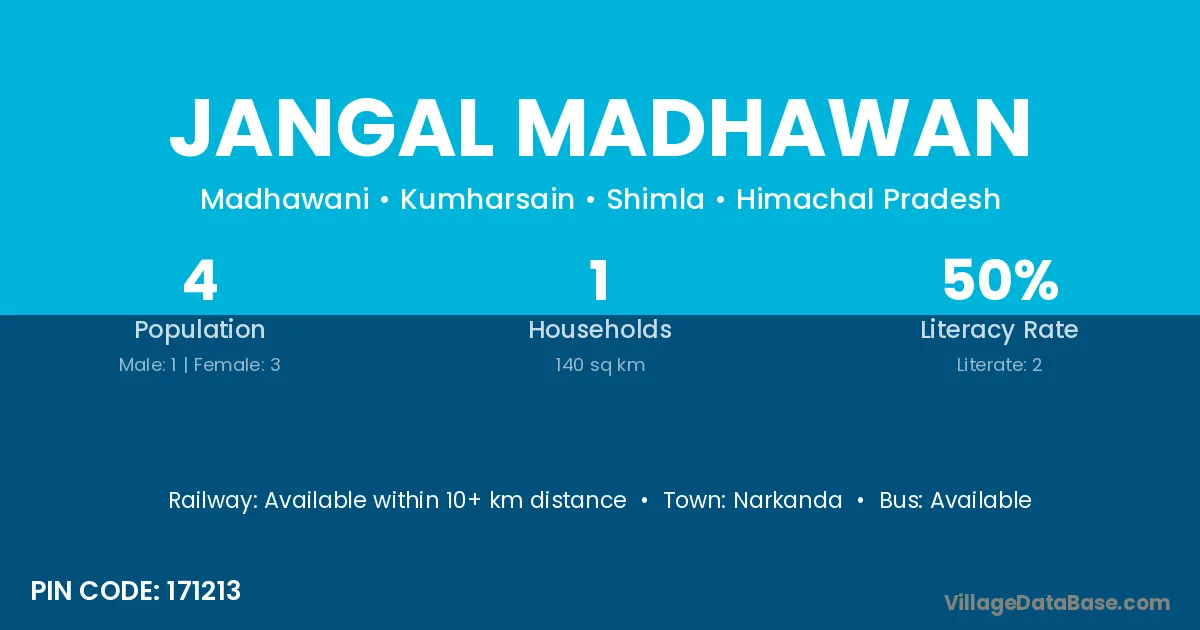 The literacy rate of Jangal Madhawan village is 50.00%. Male literacy stands at 100.00% and female literacy at 33.33%.