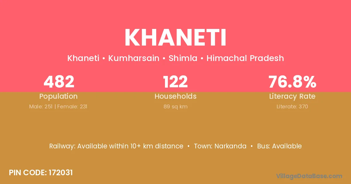 Khaneti village has a total population of 482 people, of which 251 are males and 231 are females.