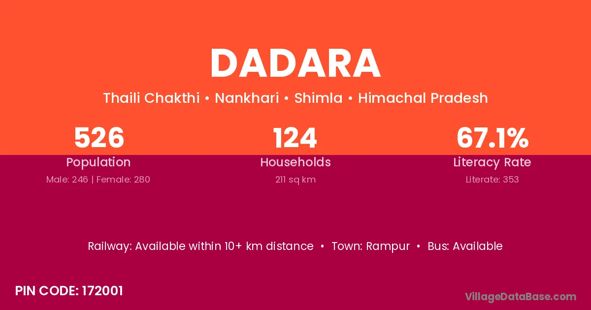 Dadara village has a total population of 526 people, of which 246 are males and 280 are females.