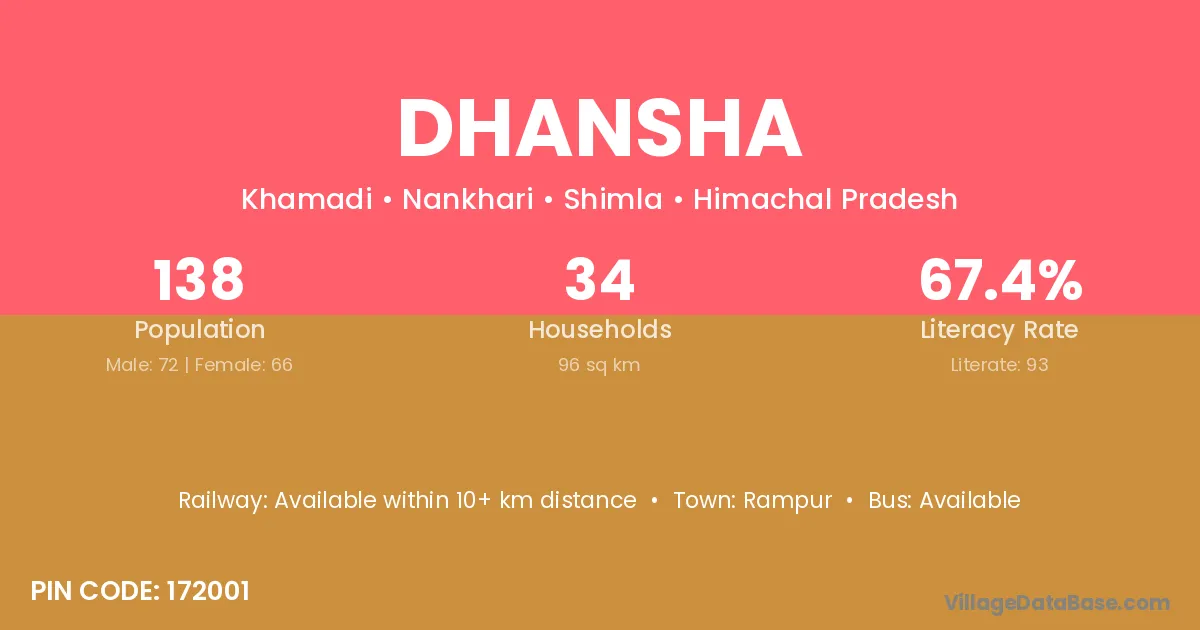 Dhansha village has a total population of 138 people, of which 72 are males and 66 are females.