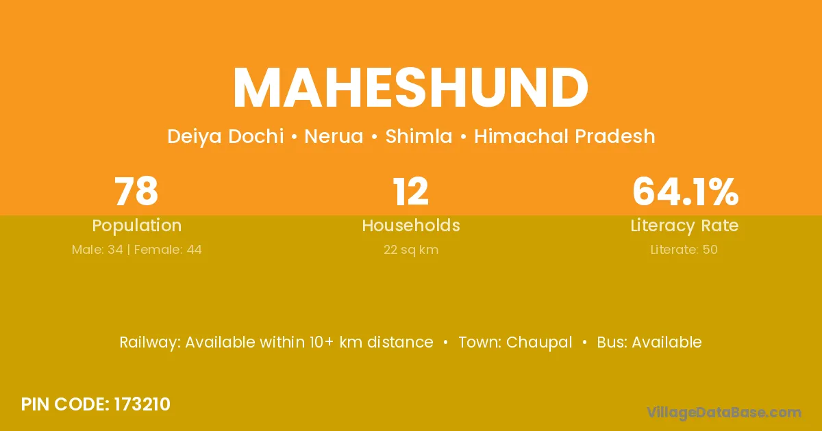 Maheshund village has a total population of 78 people, of which 34 are males and 44 are females.