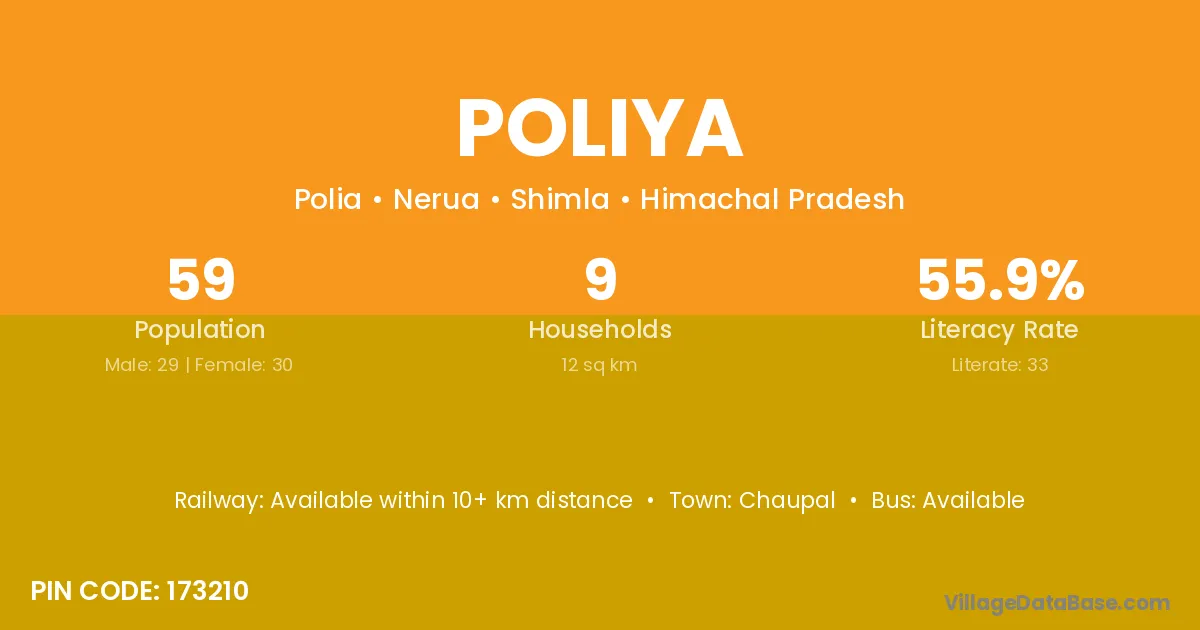 Poliya village has a total population of 59 people, of which 29 are males and 30 are females.