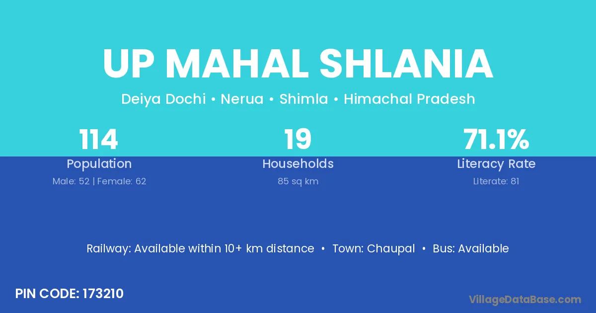 Up Mahal Shlania village has a total population of 114 people, of which 52 are males and 62 are females.