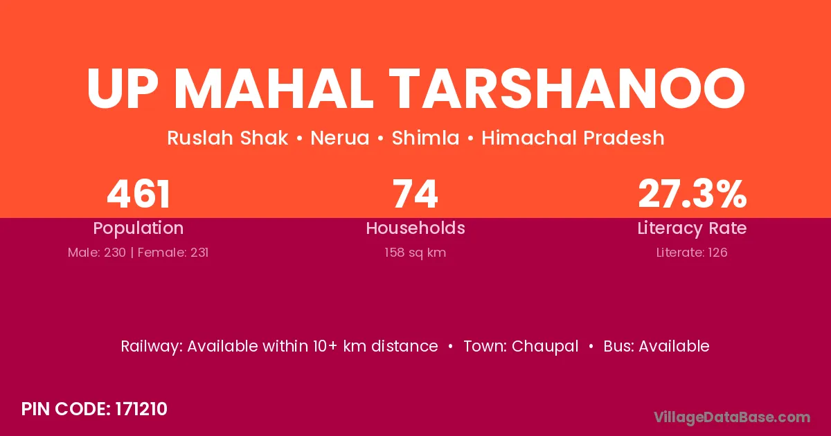 Up Mahal Tarshanoo village has a total population of 461 people, of which 230 are males and 231 are females.