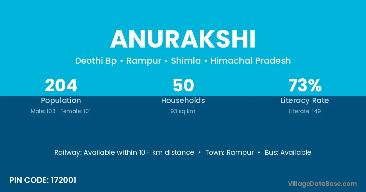 Anurakshi village has a total population of 204 people, of which 103 are males and 101 are females.