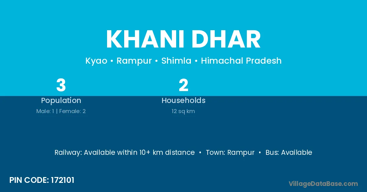 Khani Dhar village has a total population of 3 people, of which 1 are males and 2 are females.