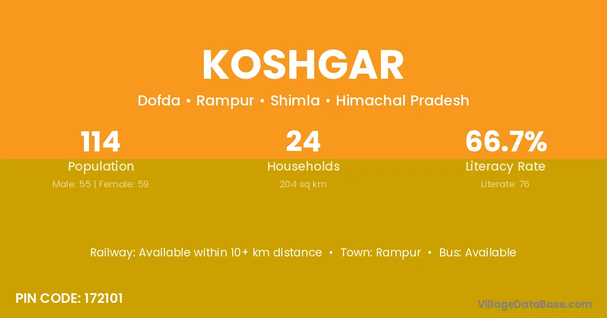 Koshgar village has a total population of 114 people, of which 55 are males and 59 are females.
