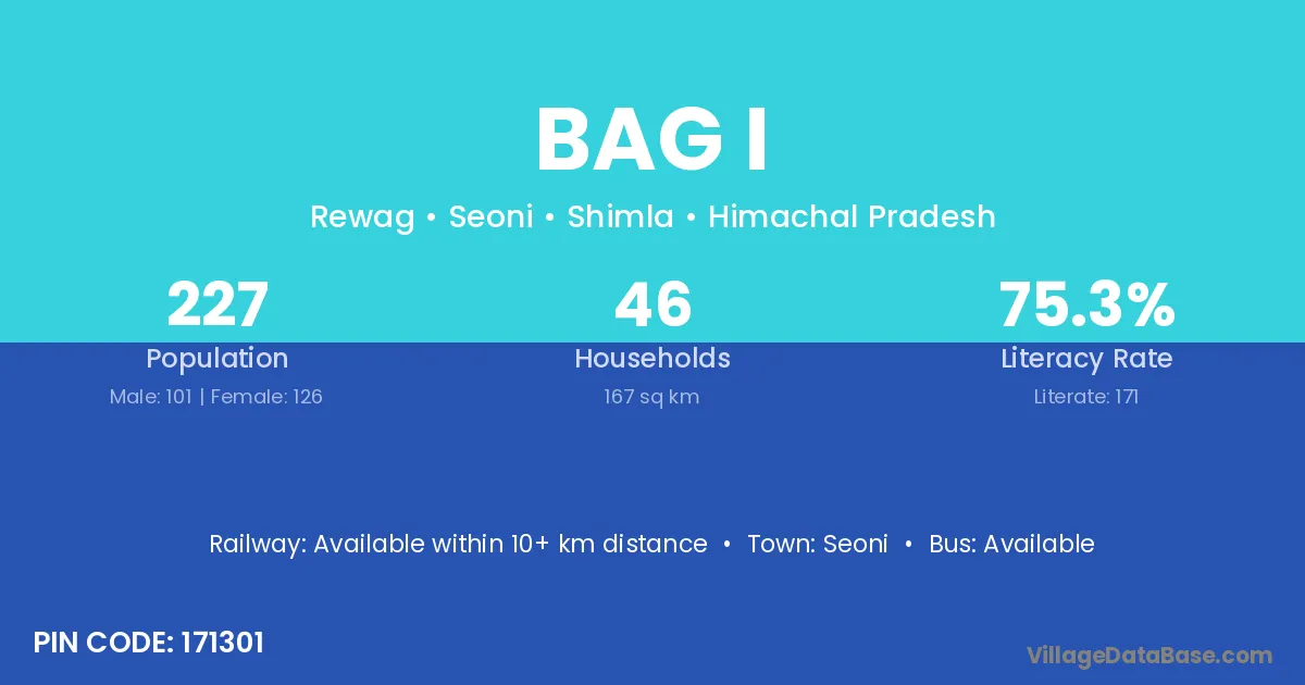 Bag I village has a total population of 227 people, of which 101 are males and 126 are females.