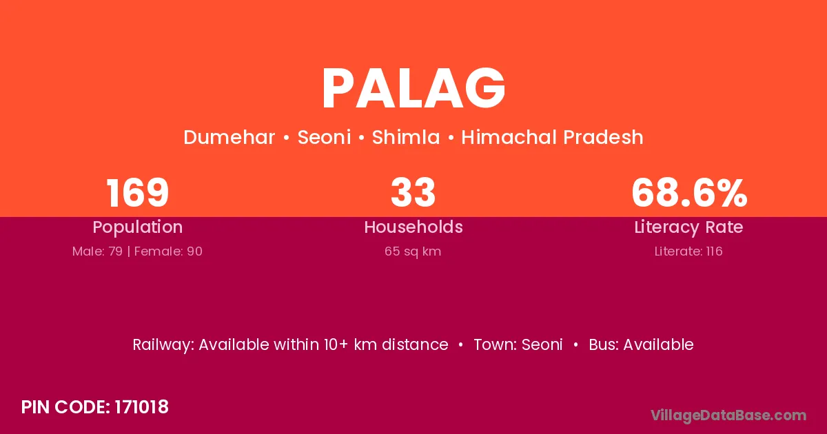 Palag village has a total population of 169 people, of which 79 are males and 90 are females.