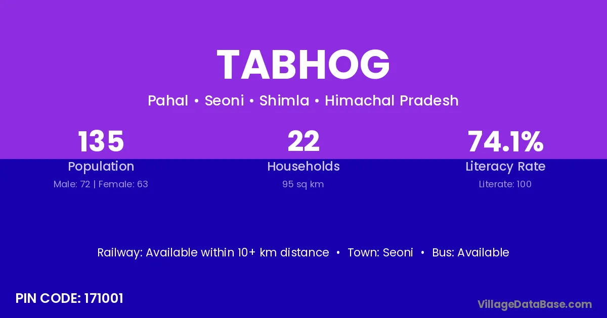 Tabhog village has a total population of 135 people, of which 72 are males and 63 are females.