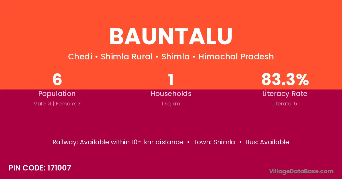 Bauntalu village has a total population of 6 people, of which 3 are males and 3 are females.