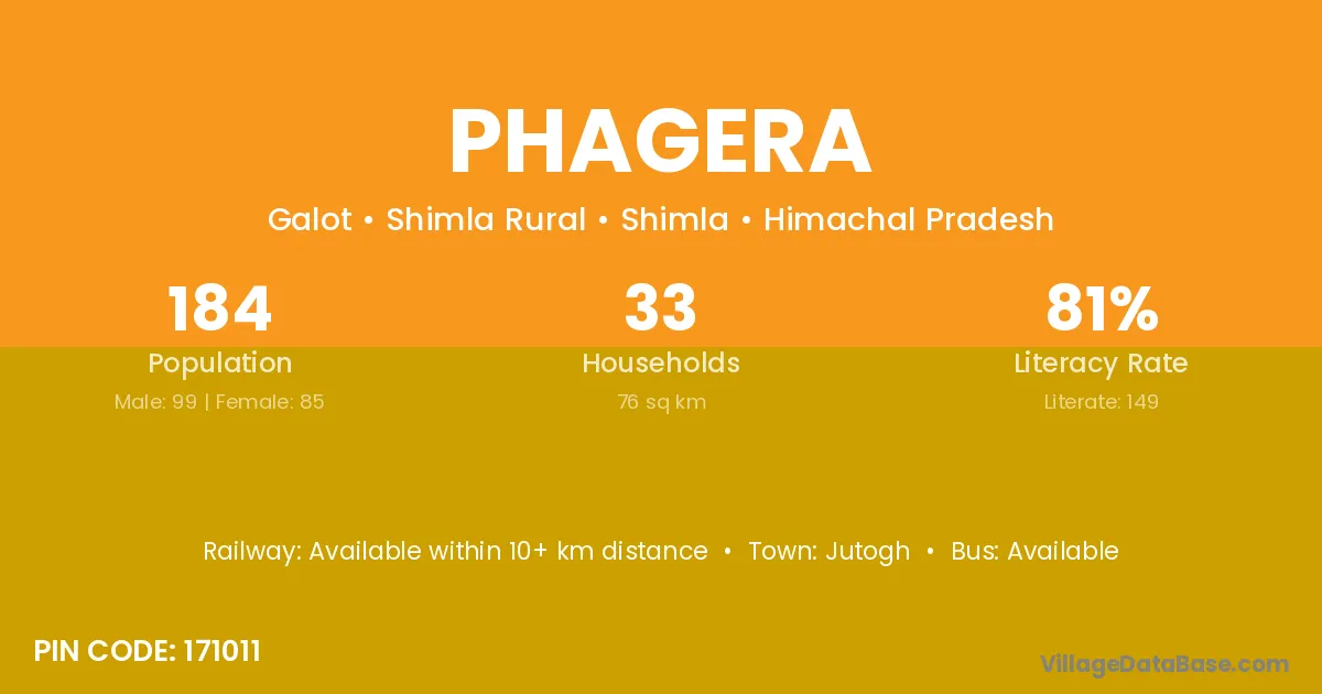 Phagera village has a total population of 184 people, of which 99 are males and 85 are females.