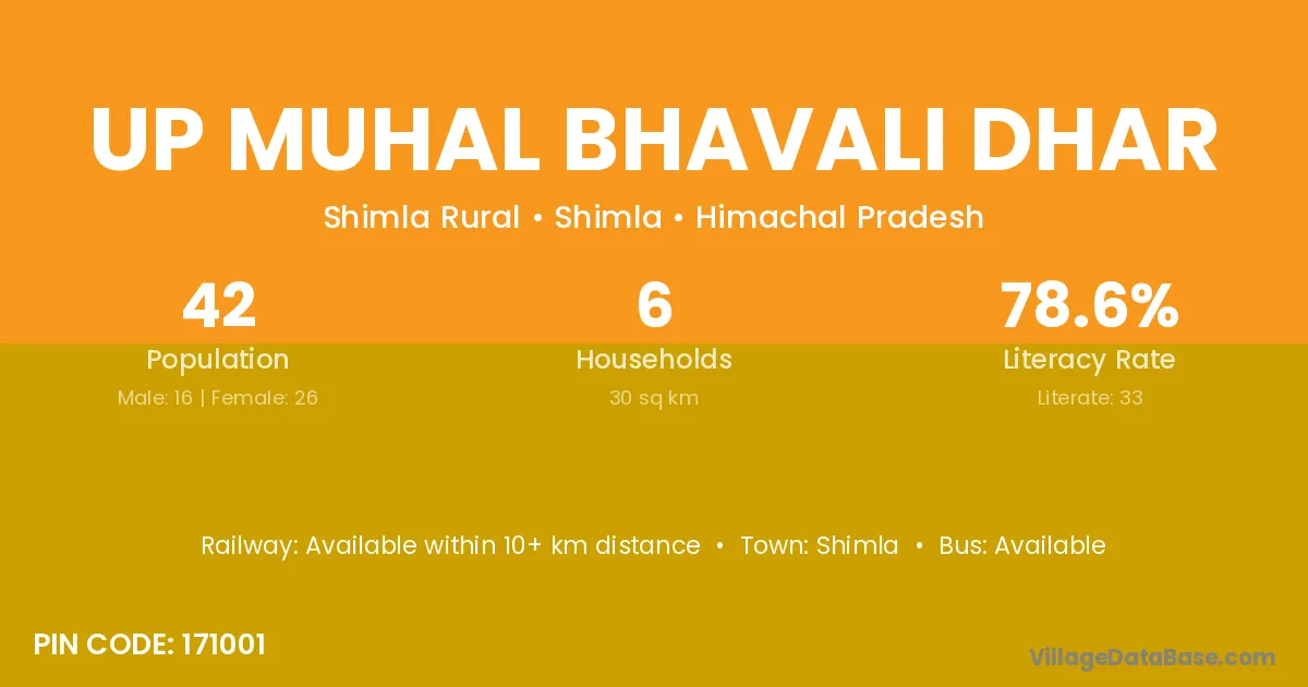 Up Muhal Bhavali Dhar village has a total population of 42 people, of which 16 are males and 26 are females.