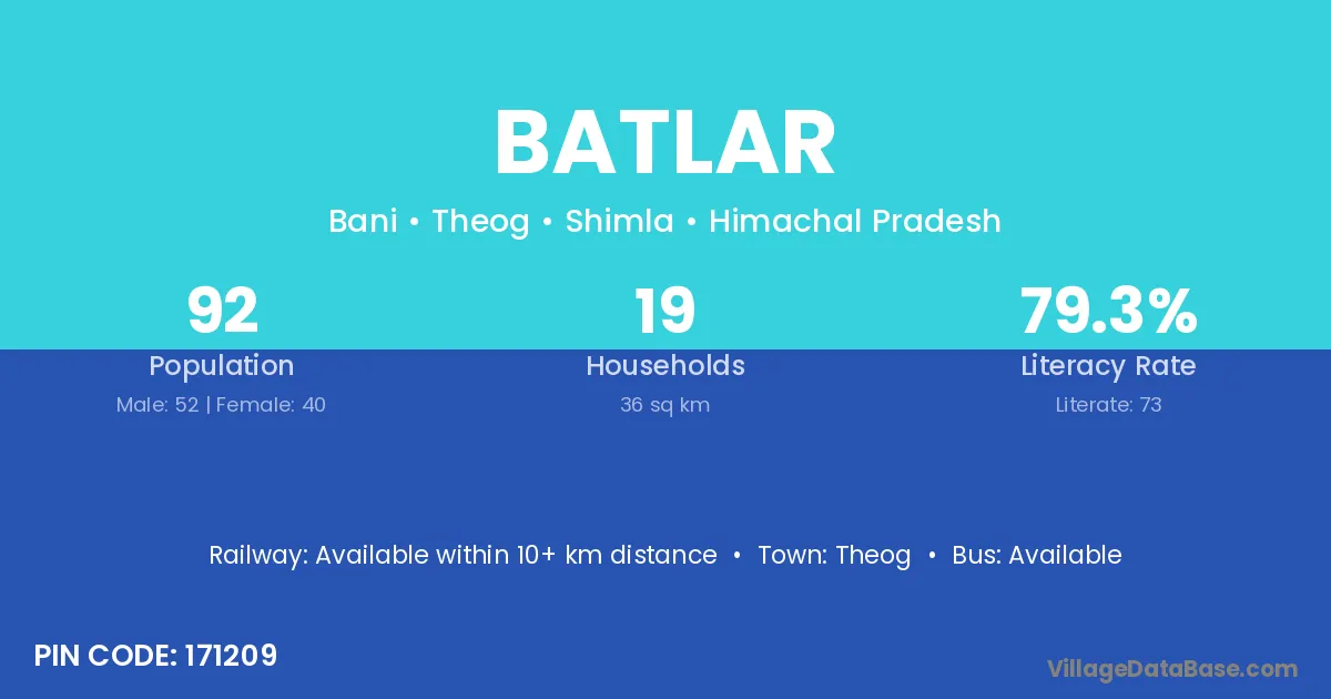 Batlar village has a total population of 92 people, of which 52 are males and 40 are females.