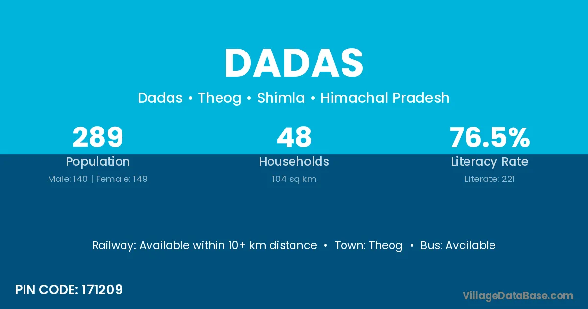 Dadas village has a total population of 289 people, of which 140 are males and 149 are females.