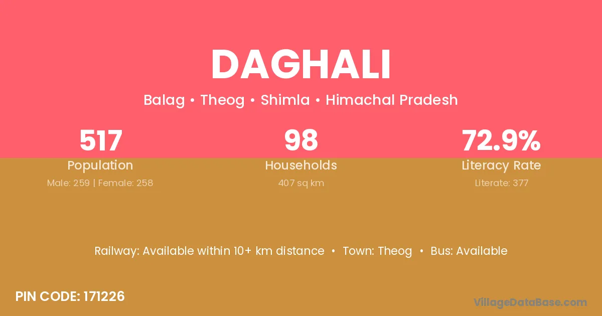Daghali village has a total population of 517 people, of which 259 are males and 258 are females.