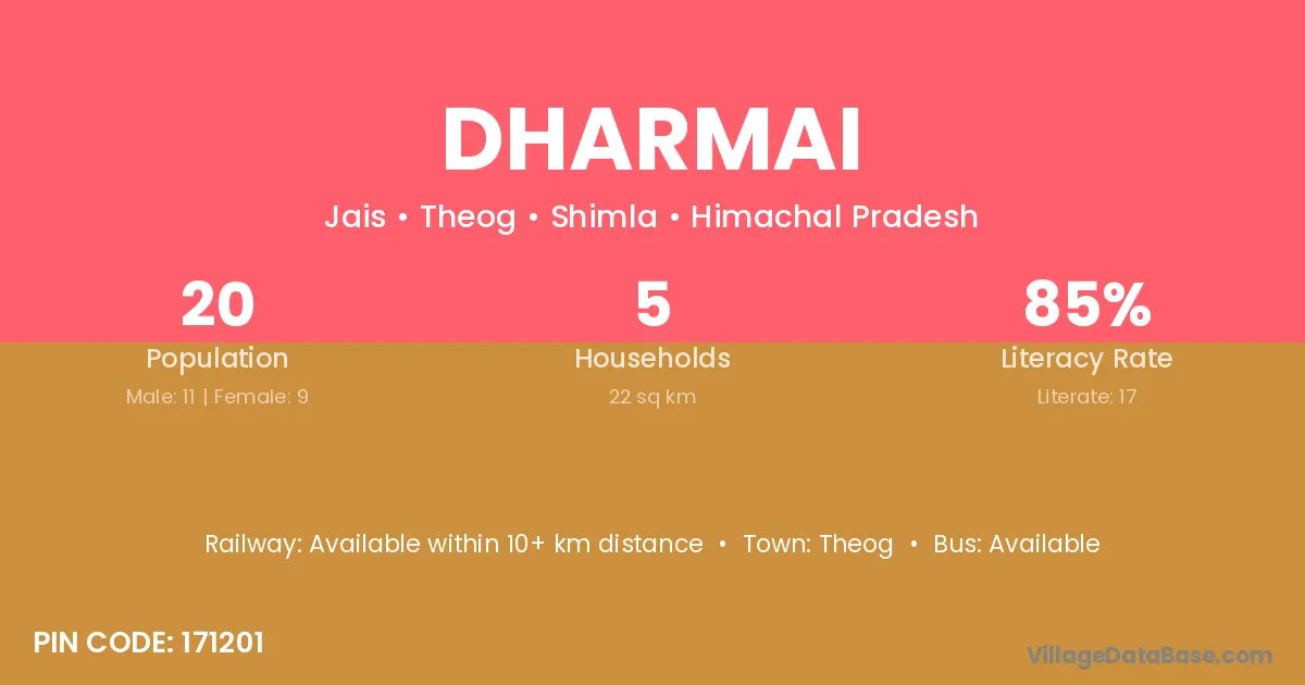 Dharmai village has a total population of 20 people, of which 11 are males and 9 are females.