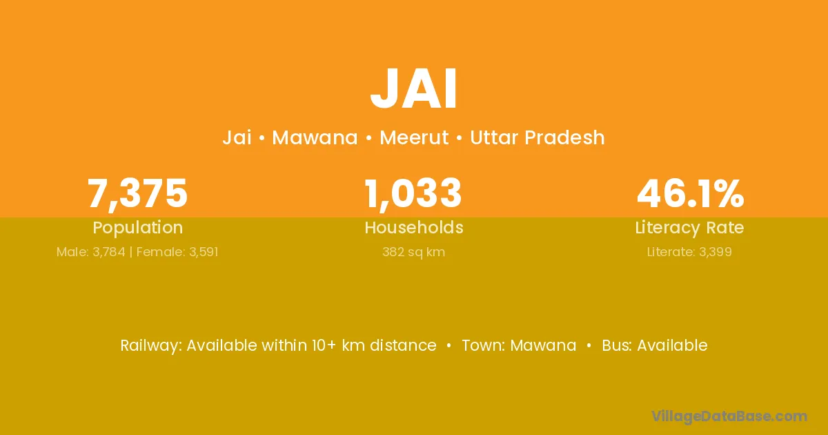 The literacy rate of Jai village is 69.49%. Male literacy stands at 71.19% and female literacy at 67.80%.