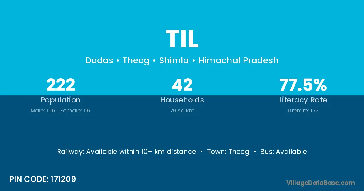 The literacy rate of Til village is 77.48%. Male literacy stands at 83.96% and female literacy at 71.55%.