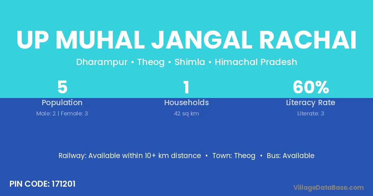 Up Muhal Jangal Rachai village has a total population of 5 people, of which 2 are males and 3 are females.