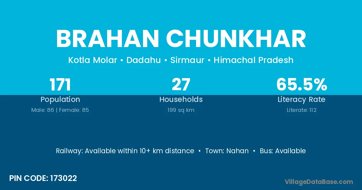 Brahan Chunkhar village has a total population of 171 people, of which 86 are males and 85 are females.