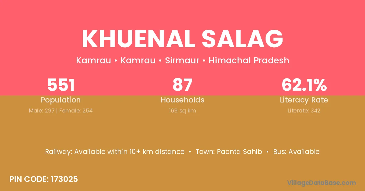 Khuenal Salag village has a total population of 551 people, of which 297 are males and 254 are females.