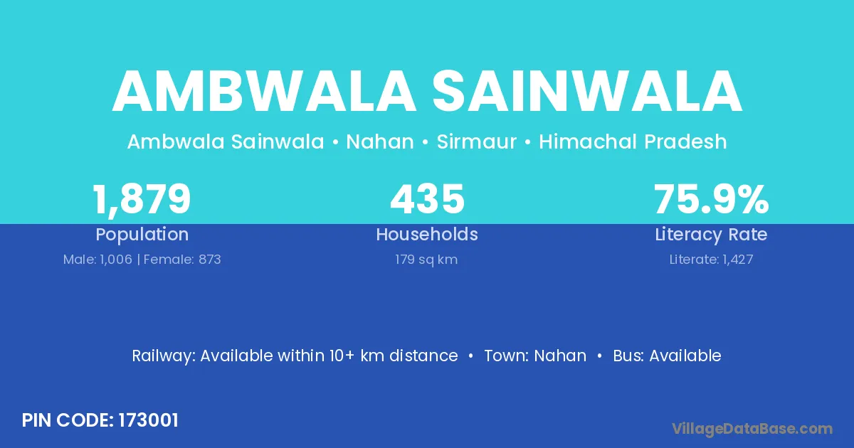 Ambwala Sainwala village has a total population of 1,879 people, of which 1,006 are males and 873 are females.