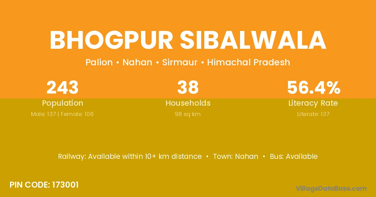 Bhogpur Sibalwala village has a total population of 243 people, of which 137 are males and 106 are females.