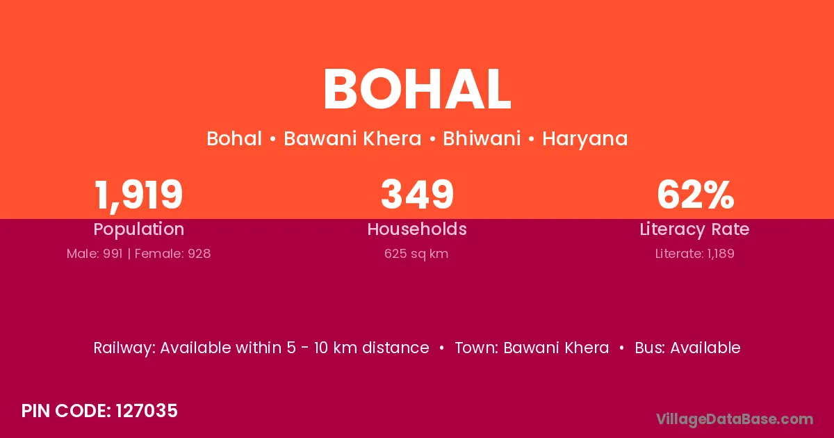 The literacy rate of Bohal village is 82.00%. Male literacy stands at 82.35% and female literacy at 81.71%.