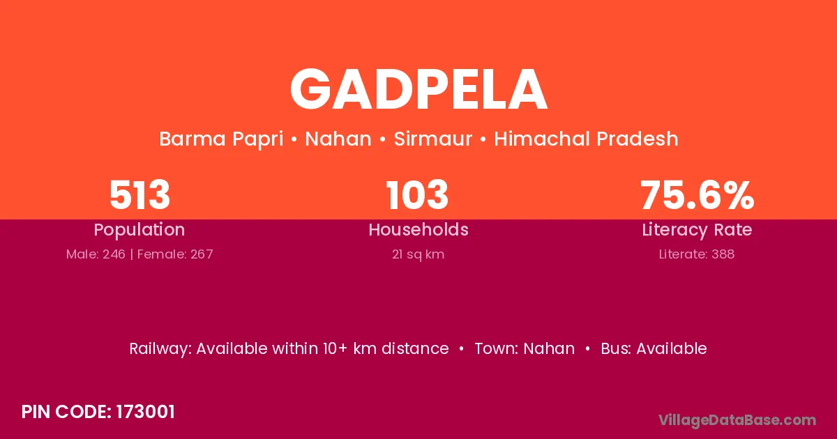 According to Census 2011 information, the village code of Gadpela village is 173001.