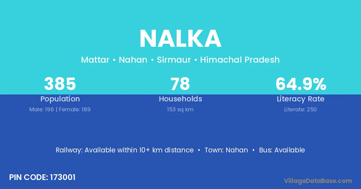 Nalka village has a total population of 385 people, of which 196 are males and 189 are females.