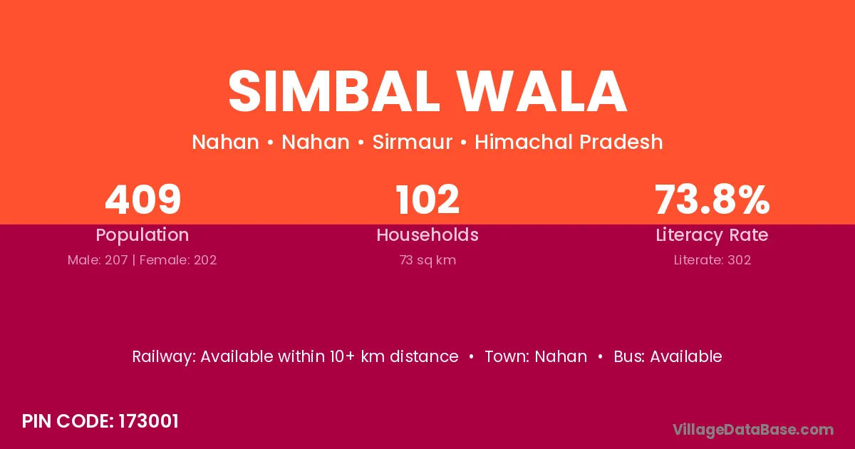 Simbal Wala village has a total population of 409 people, of which 207 are males and 202 are females.