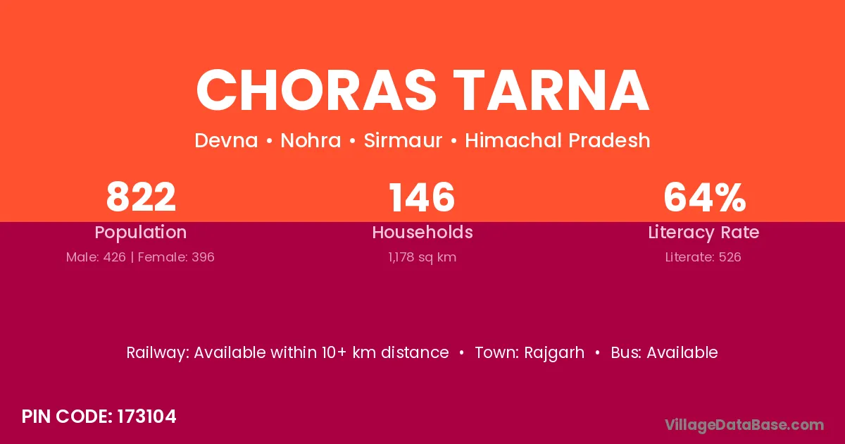 Choras Tarna village has a total population of 822 people, of which 426 are males and 396 are females.