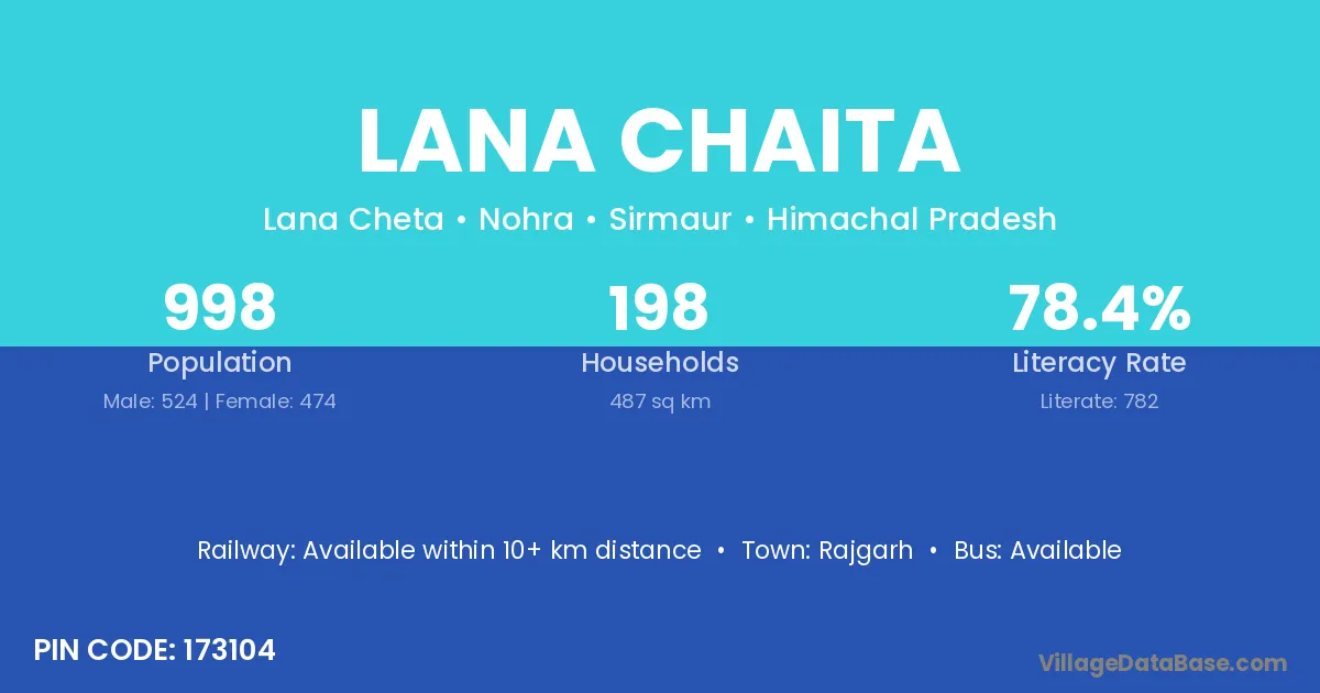 Lana Chaita village has a total population of 998 people, of which 524 are males and 474 are females.