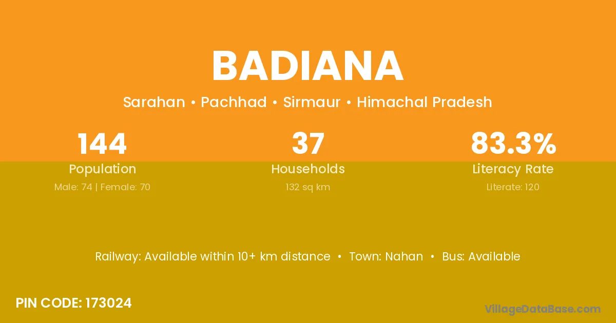 According to Census 2011 information, the village code of Badiana village is 173024.
