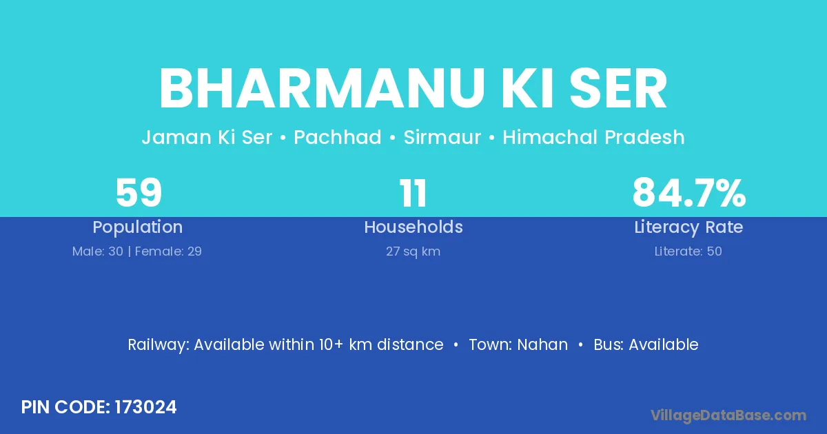 Bharmanu Ki Ser village has a total population of 59 people, of which 30 are males and 29 are females.