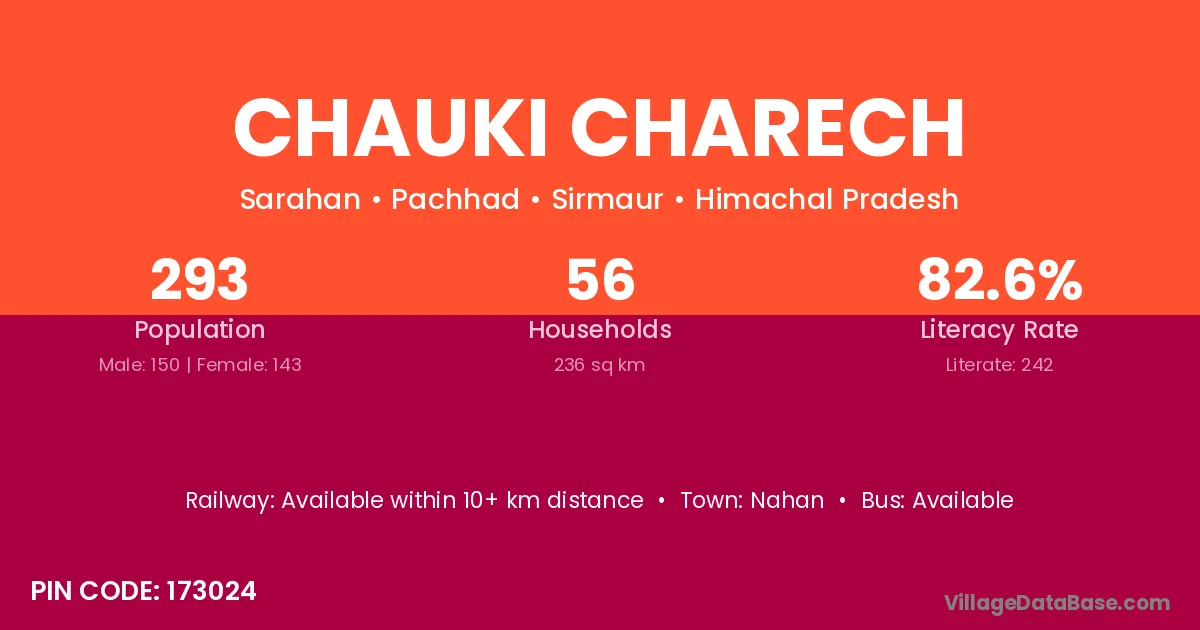 Chauki Charech village has a total population of 293 people, of which 150 are males and 143 are females.