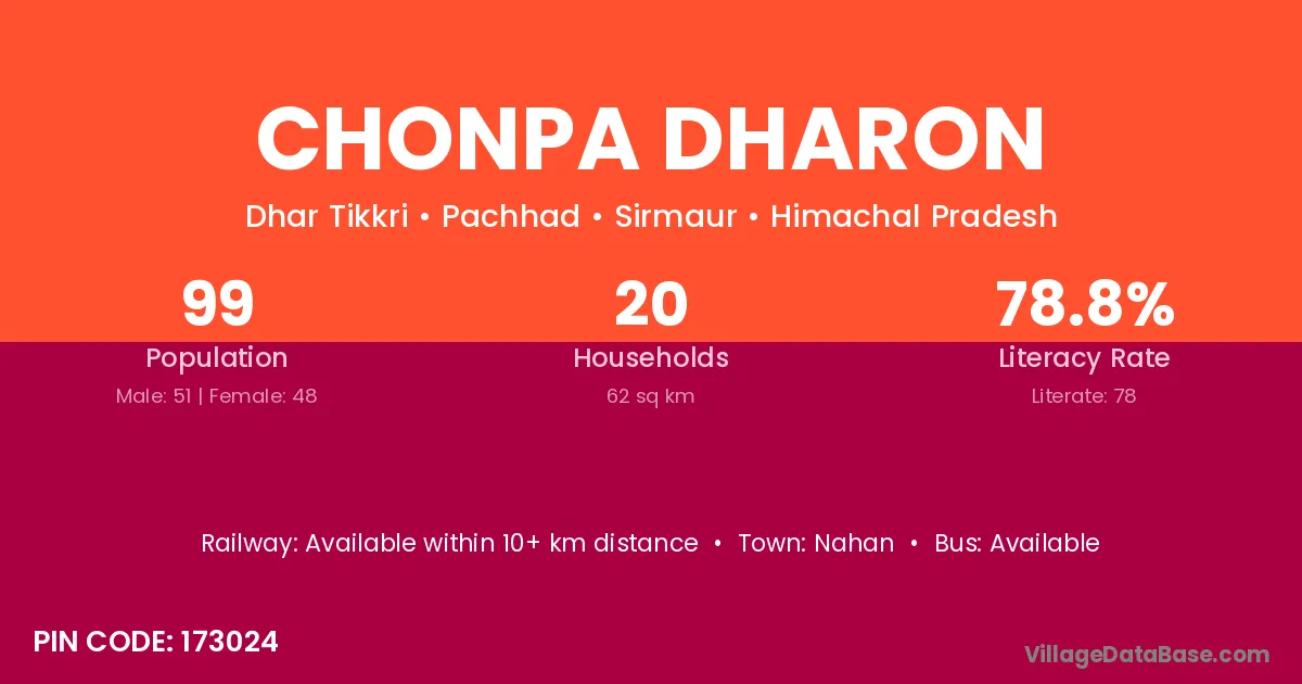Chonpa Dharon village has a total population of 99 people, of which 51 are males and 48 are females.