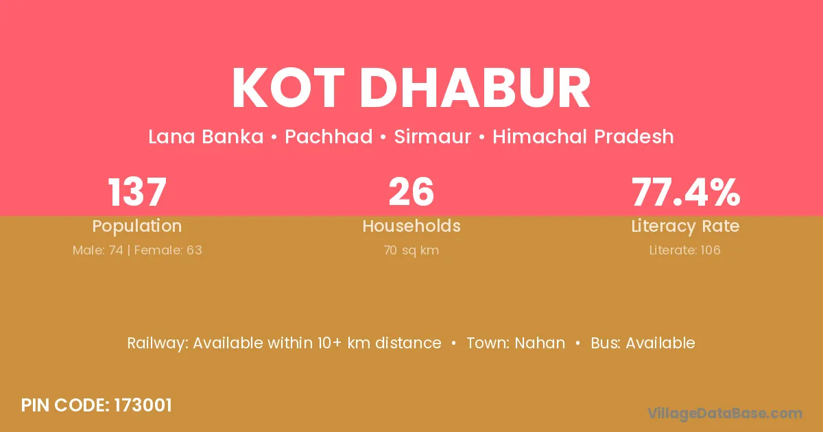 Kot Dhabur village has a total population of 137 people, of which 74 are males and 63 are females.