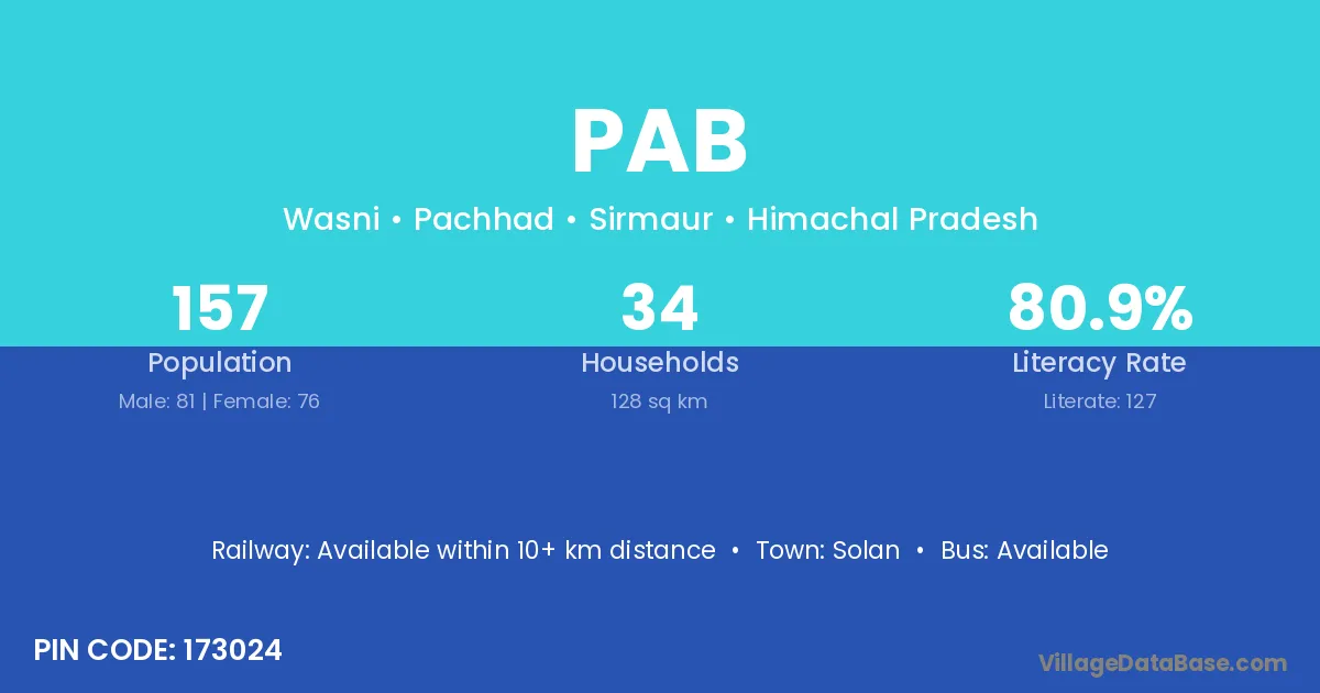 According to Census 2011 information, the village code of Pab village is 173024.